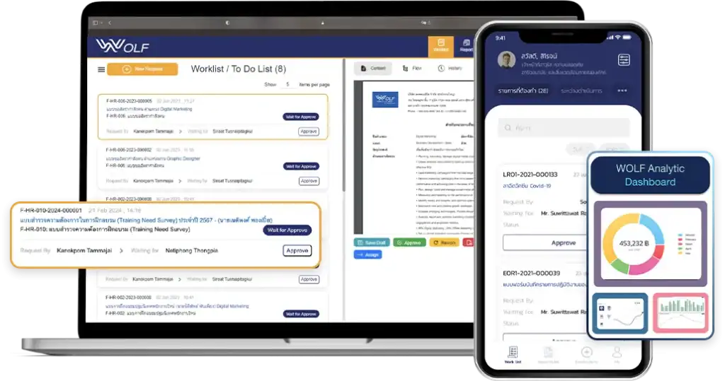 WOLF Approve คือระบบอนุมัติเอกสาร และการจัดการเอกสารออนไลน์ สามารถสร้างแบบฟอร์ม (e-Form) ให้สอดคล้องกับการใช้งานขององค์กรนั้นๆ ซึ่ง WOLF Approve ถูกออกแบบมาให้ตอบโจทย์ใน เรื่องของความสะดวก ง่ายต่อการใช้งาน รองรับการใช้งานบนอุปกรณ์ต่างๆ ผ่านเบราเซอร์ และแอปพลิเคชัน